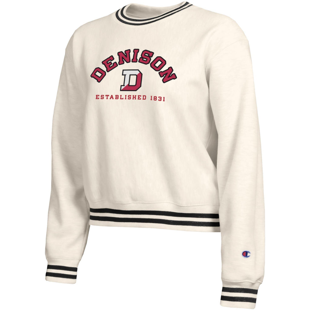 Champion Reverse Weave Crop Crew Sweatshirt, featuring an Arched Denison and Split D logo on the front and striped cuffs, hem and neck