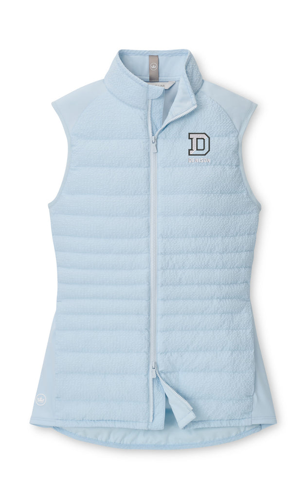 Peter Millar Ladies Fuse Seersucker Hybrid Vest in Light Blue. Featuring a double zipper and an embroidered Denison logo on left chest